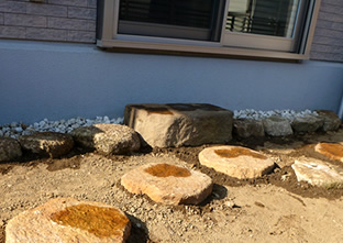 今回、和風庭に近づけたいというご要望から、「飛び石」と「くつぬぎ石」の設置を依頼されました。お客様のお庭のイメージを考慮し、それに合わせた石を選定。用途を考えながら、バランスよく設置しました。